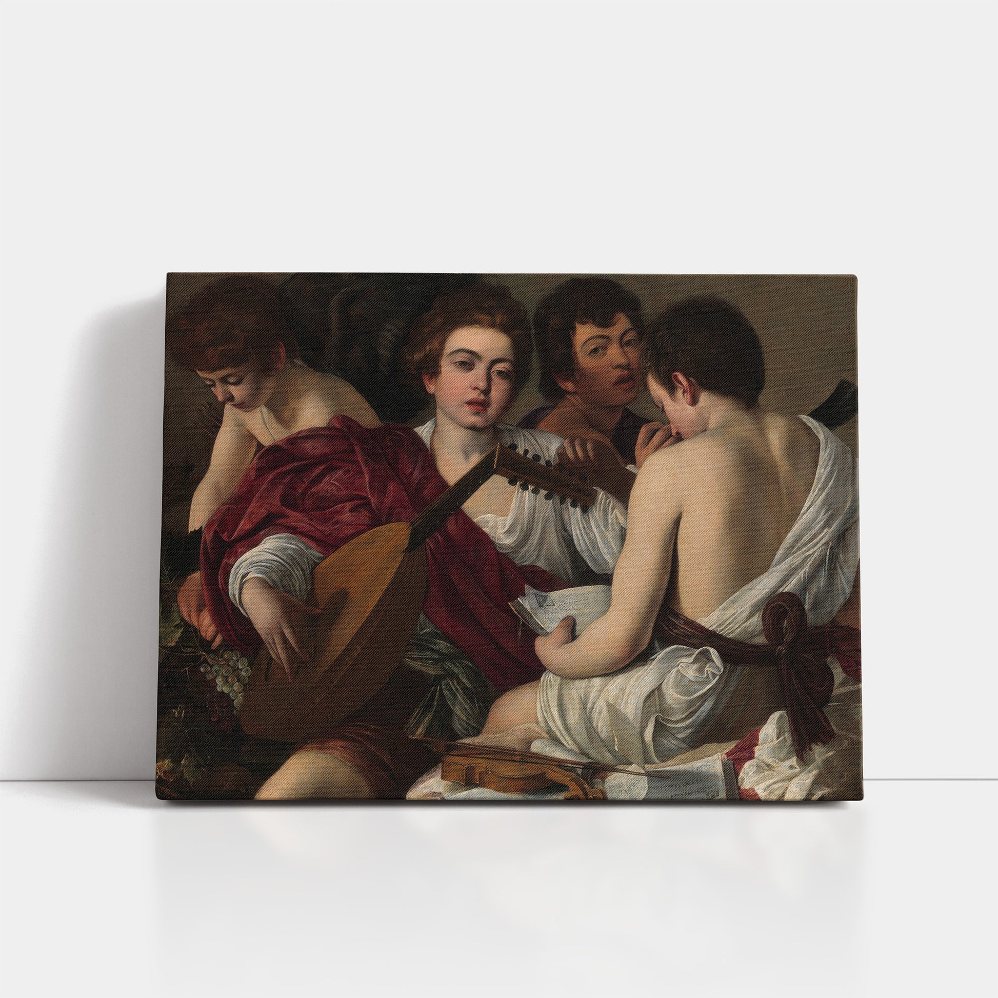 “The Musicians (Concert of Youths)” by Caravaggio, painted in 1595, is a masterful Baroque composition capturing four young men engaged in music-making. Rendered with dramatic lighting and lifelike detail, the painting conveys sensuality, emotion, and theatrical intimacy. The inclusion of classical instruments, a Cupid, and rich textures reflects Caravaggio’s deep interest in music, mythology, and human interaction—hallmarks of his early Roman period.